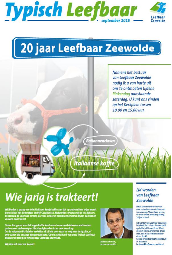 Op dinsdag 1 september ontvingen alle Zeewolder huishoudens (met uitzondering van de Nee-stickers) de Typisch Leefbaar 2015. Deze uitgave is mede ter gelegenheid van het 20-jarig bestaan van dé lokale partij van Zeewolde! Wij vieren dit jubileum graag met u op de Pinkendag, zaterdag 5 september 2015. U kunt ons vinden op het Kerkplein. De koffie staat klaar!