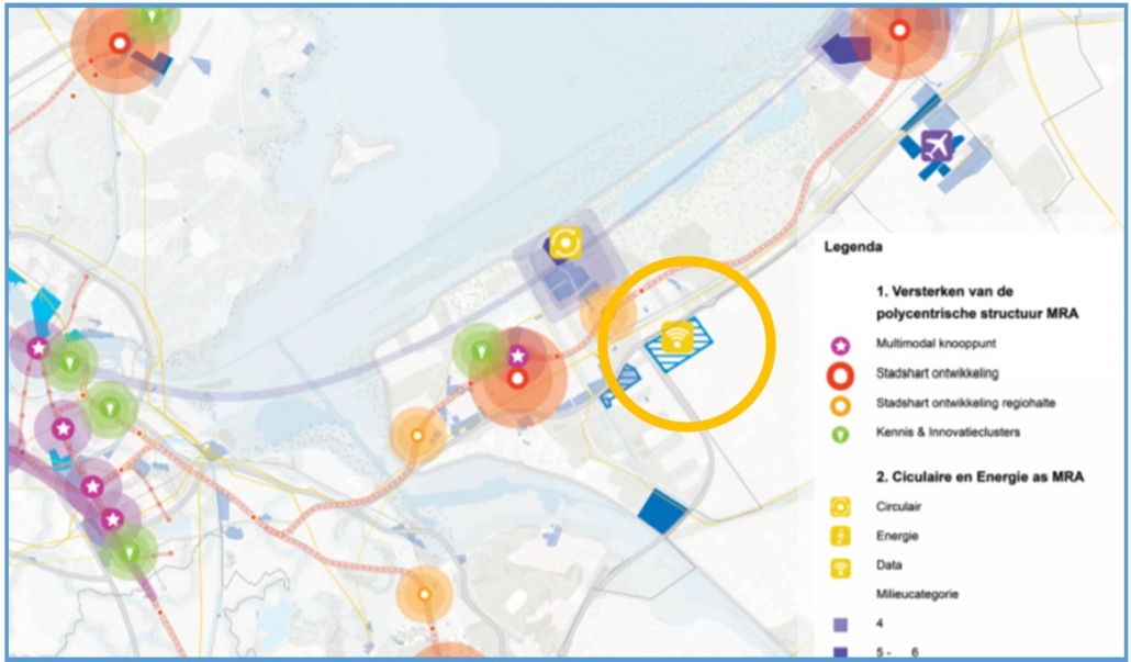 In de oranje cirkel ligt het 150 Ha locatie gebied (Blauw gearceerde rechthoek met wifi symbool) voor Data center cluster nabij A6 en A27 in Oosterwold.