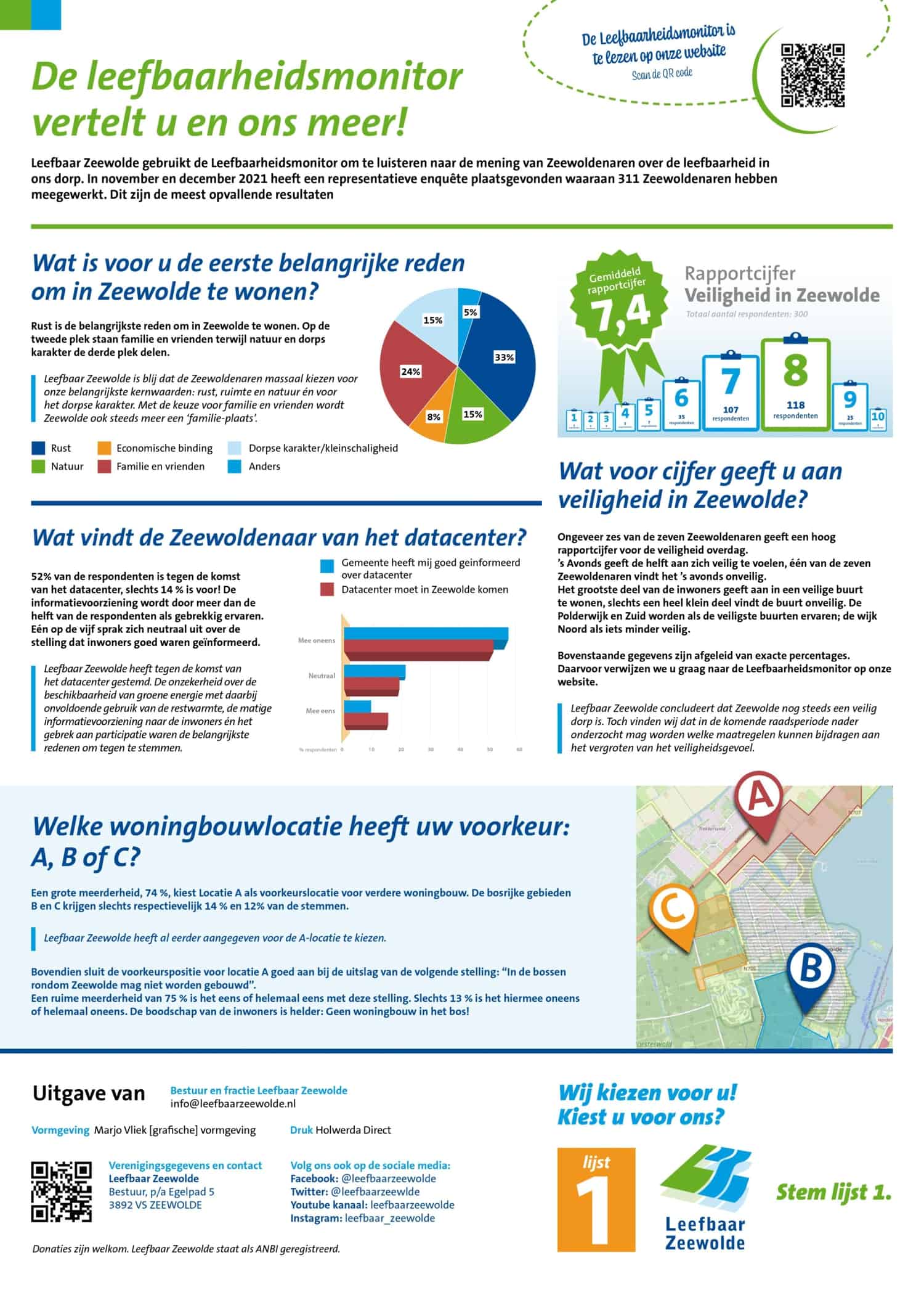 Op initiatief van Leefbaar Zeewolde hebben de onderzoekers van Hogeschool Windesheim uit Zwolle in het najaar van 2021, de mening gepeild onder 311 inwoners. Met deze enquête die over tien thema’s gaan, luisteren wij naar wat de inwoners van ons dorp vinden. Daarnaast is een enquête vraag gesteld over het datacenter.