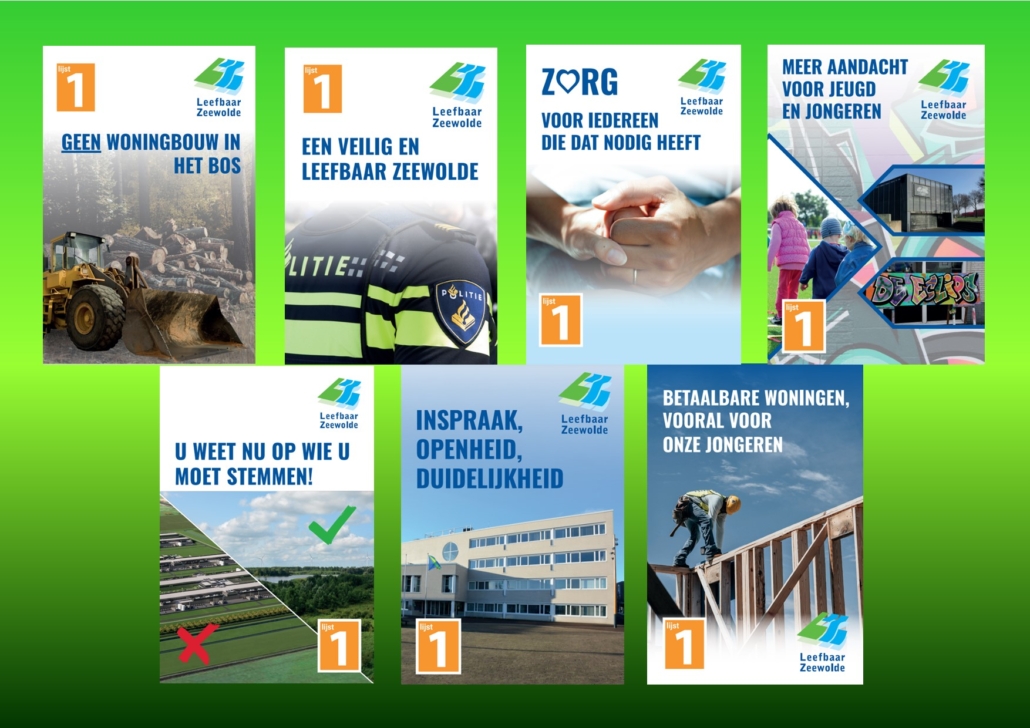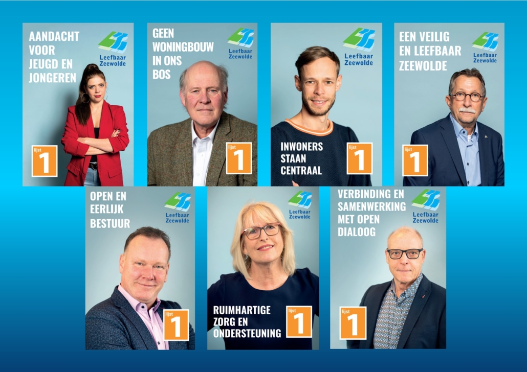 Op 14 plaatsen in Zeewolde hangen posters van 7 kandidaten en 7 belangrijke thema’s.